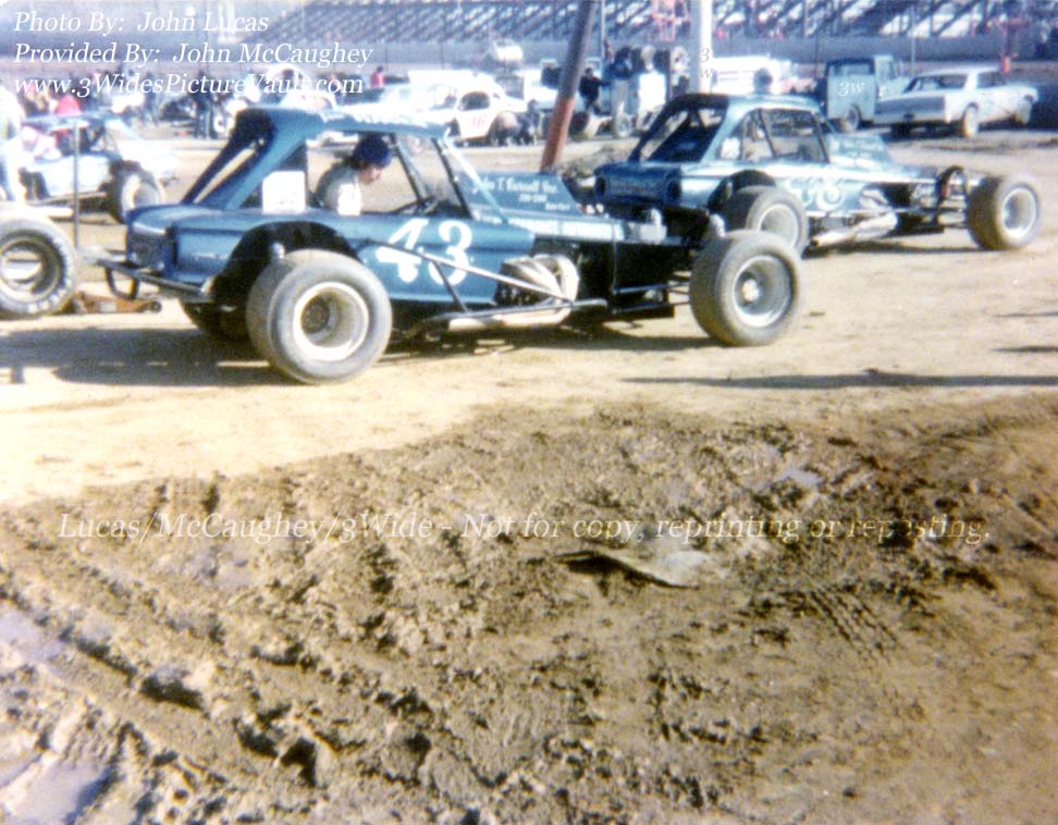 blue Hager Falcon facing the other direction on the left. I'm not sure why Howie was in the #43 on this day but my guess would be that it was tied into that both cars had John T. Burnett on the hood. |