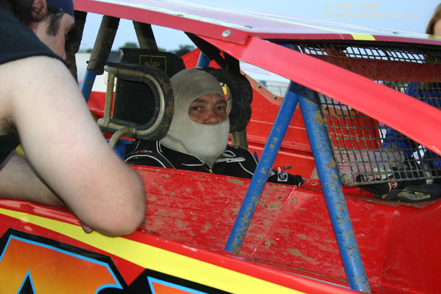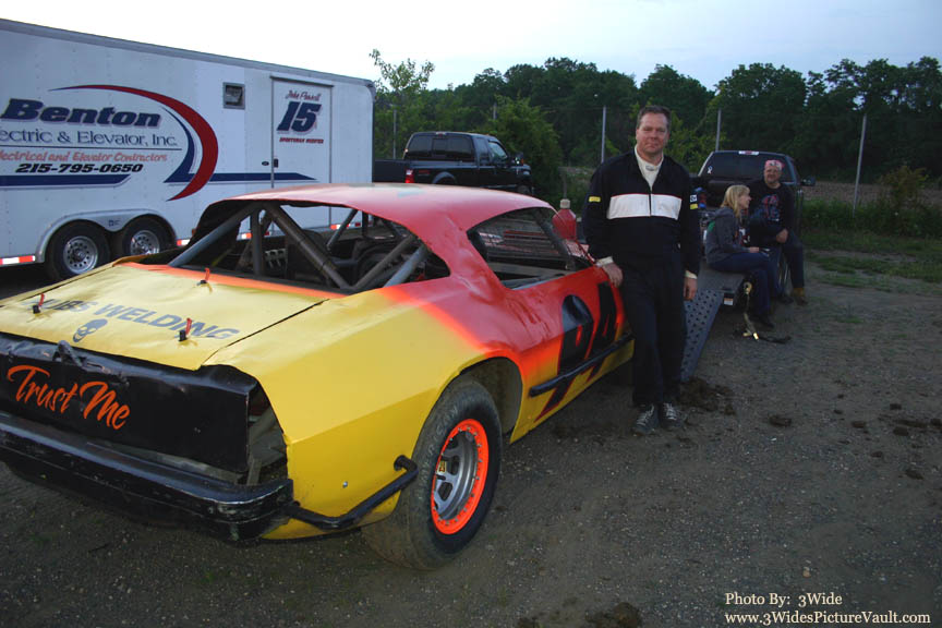 Crew member helps Modified driver Tommy Carberry back up from his pits stall... These things don't have mirrors!