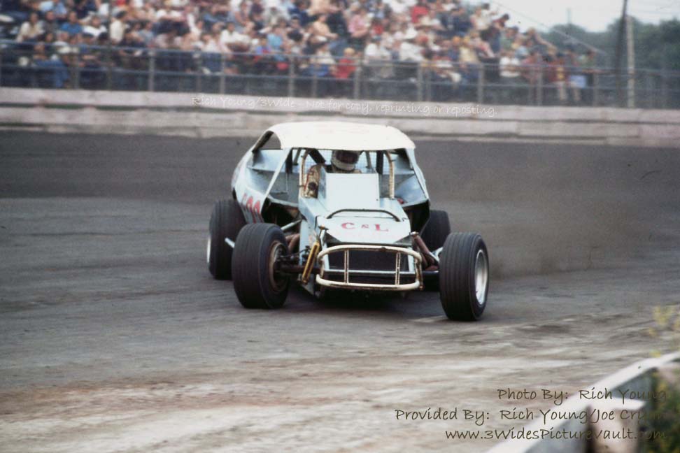 | Driver (s) : | Chip Slocum? Sandy Rochelle? Other?.... (I remember Chip driving the Gremlin and Paul driving the Pinto, so I'm not sure who this is in this photo... I can't remember what year Chip started racing, so if it was after 1975, then that would eliminate Chip.... The size of the headers look like a small block..... so I'm thinking that this might be a sportsman car, but not sure. Also, I remember Sandy Rochelle usually wore a 3/4 helmet and bandana, so that might rule him out too... Let me know what you guys think - Thanks.) |