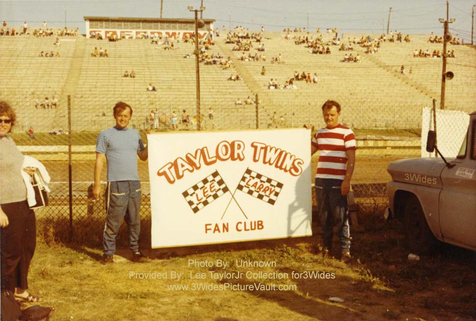 | Comments: | Comment: The "Taylor Twins" Larry and Lee... or is it Lee and Larry... at Harmony Speedway hold up a sign created by their Fan Club in front of the huge grandstand at Harmony Speedway. |
