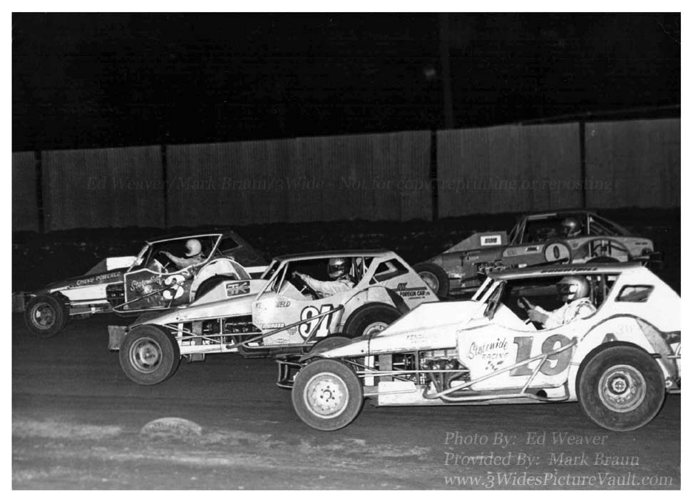| 11.26.14 | 3Wide | Really great image showing 3 Weld built cars in competition, with Kenny Weld driving the #91, (one of the original Weld cars), Kenny Brightbill in the Weld built white Statewide #19, and Gary Balough in the Weld built red Statewide #3. |